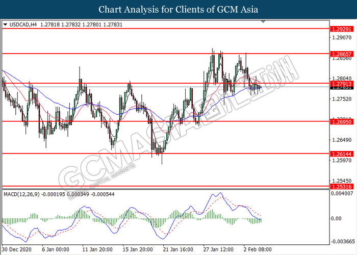 USDCAD, H4: USDCAD was traded flat below the resistance level at 1.2790. MACD which illustrate diminishing bearish momentum signal suggest the pair to be traded higher in short term.