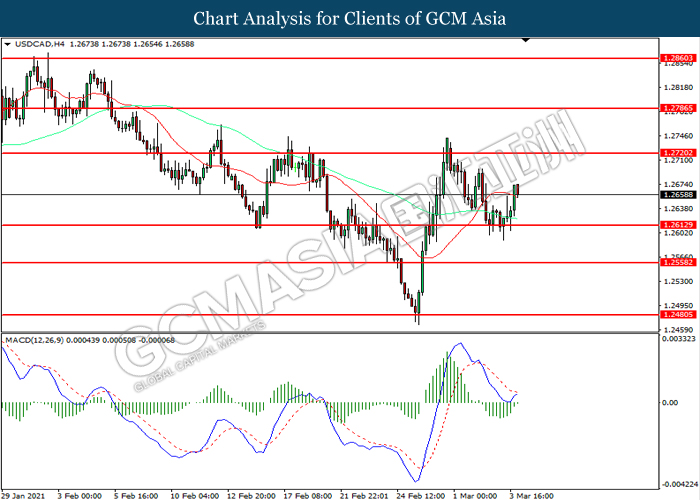 USDCAD, H4: USDCAD was traded higher following prior rebound from the support level at 1.2615. MACD which illustrated diminishing bearish momentum suggest the pair to extend its gains toward resistance level at 1.2720.