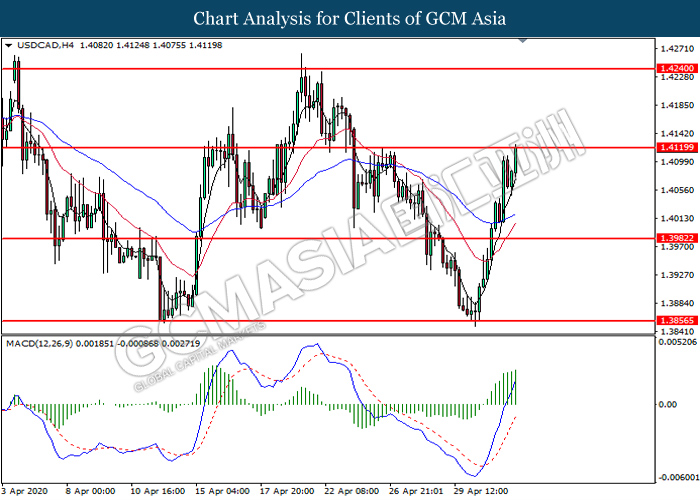 USDCAD, H4: USDCAD was traded higher while currently testing the resistance level at 1.4120. MACD which illustrate bullish bias momentum suggests the pair to extend its gains after it successfully breakout above the resistance level.