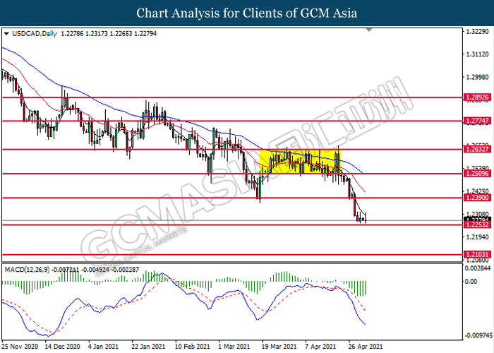 USDCAD, Daily: USDCAD was traded lower while currently testing the support level at 1.2255. MACD which illustrated bearish bias momentum suggest the pair to extend its losses after it successfully breakout below the support level.