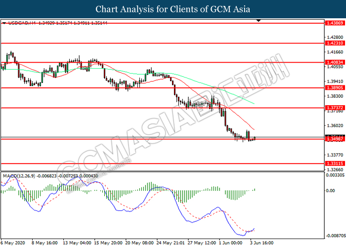 USDCAD, H4: USDCAD was traded lower while currently testing the support level at 1.3500. However, MACD which illustrated increasing bullish momentum suggest the pair to be traded higher in short-term as technical correction.
