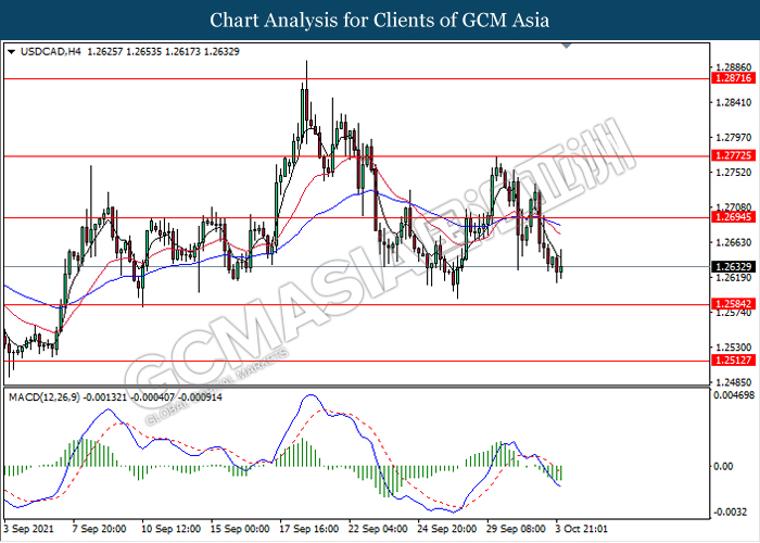 USDCAD, H4: USDCAD was traded lower while currently testing near the support level 1.2585. MACD which illustrate bearish momentum signal suggest the pair to extend its losses after it breaks below the support level.