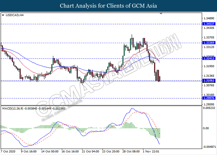 USDCAD, H4: USDCAD was traded lower while currently testing the support level 1.3105. MACD which illustrate ongoing bearish momentum signal suggest the pair to extend its losses after it breaks below the support level.