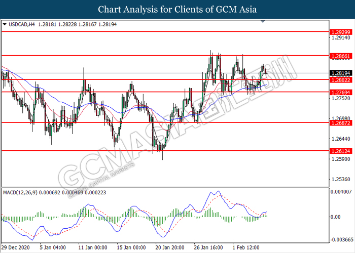 USDCAD, H4: USDCAD was traded lower following prior retracement from the higher level. MACD which illustrate diminishing bullish momentum signal suggest the pair to be traded lower toward the support level at 1.2800.