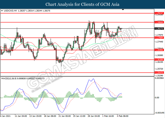 USDCAD, H4: USDCAD was traded higher following prior rebound from the support level at 1.2770. MACD which illustrated increasing bullish momentum suggest the pair to extend its gains toward resistance level at 1.2765.