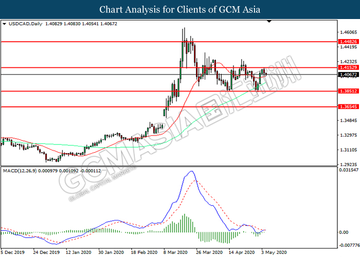 USDCAD, Daily: USDCAD was traded higher while currently testing the resistance level at 1.4155. MACD which illustrated diminishing bearish momentum suggest the pair to extend its gains after it successfully breakout above the resistance level.