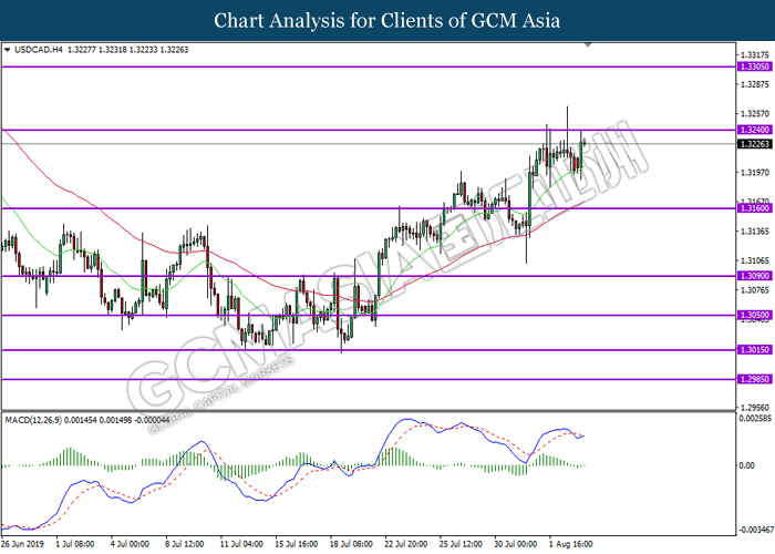 USDCAD, H4: USDCAD was traded higher while currently testing near the resistance level 1.3240. MACD which display bullish bias signal suggest the pair to extend its gains after successfully breaking above the resistance level.