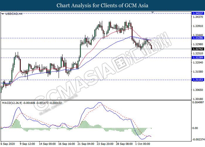 USDCAD, H4: USDCAD was traded lower following prior retracement from the resistance level 1.3330. MACD which illustrate ongoing bearish bias signal suggest the pair to extend its retracement towards the support level 1.3230.