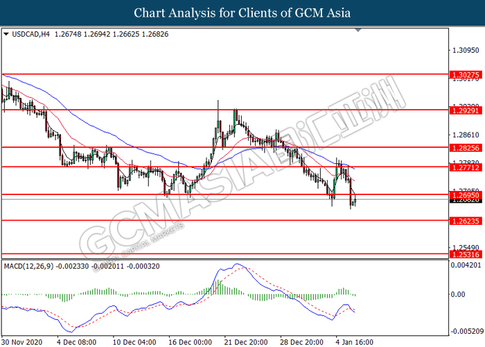 USDCAD, H4: USDCAD was traded higher following prior rebound from the lower level. However, MACD which illustrated bearish bias momentum suggest the pair to be traded lower toward the support level.
