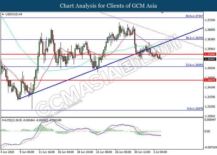 USDCAD, H4: USDCAD was traded lower following prior breakout below the previous support level at 1.3565. However, MACD which illustrated diminishing bearish momentum suggest the pair to be traded higher in short-term as technical correction.