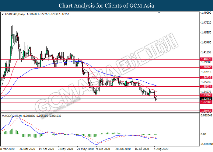 USDCAD, Daily: USDCAD was traded lower following prior breakout below the previous support level at 1.3335. MACD which illustrate bearish bias momentum suggest the pair to extend its losses toward the support level at 1.3210.