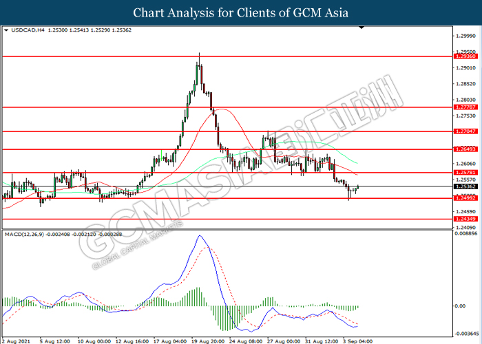 USDCAD, H4: USDCAD was traded lower following prior breakout below the previous support level at 1.2580. However, MACD which illustrated diminishing bearish momentum suggest the pair to be traded higher in short-term as technical correction.