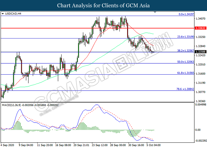 USDCAD, H4: USDCAD was traded lower while currently testing the support level at 1.3255. However, MACD which illustrated diminishing bearish momentum suggest the pair to be traded higher in short-term as technical correction.