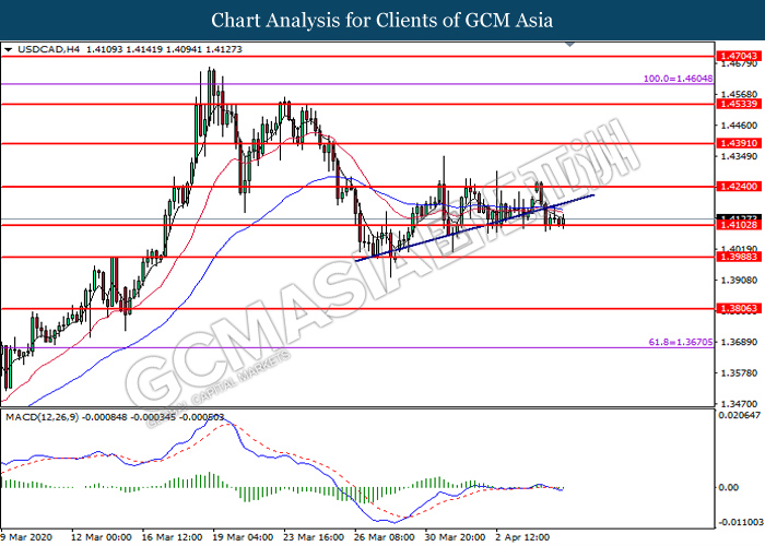 USDCAD, H4: USDCAD was traded lower while currently testing the support level at 1.4105. Due to lack of signal from MACD, it is suggested to wait for further confirmation such as breakout or rebound before entering into the market.
