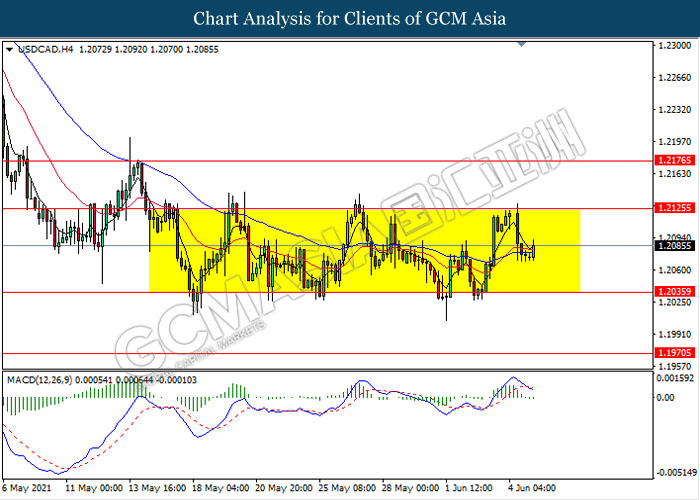 USDCAD, H4: USDCAD remain traded in a sideway channel following recent retracement from the resistance level 1.2125. However, MACD which illustrate bearish momentum signal with the formation of death cross suggest the pair to be traded lower towards the support level 1.2035.