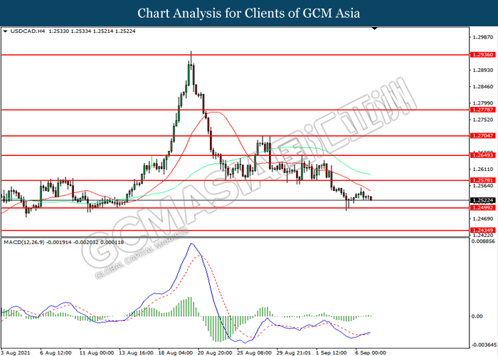USDCAD, H4: USDCAD was traded lower following prior breakout below the previous support level at 1.2580. MACD which illustrated diminishing bullish momentum suggest the pair to extend its losses after it successfully breakout below the support level.