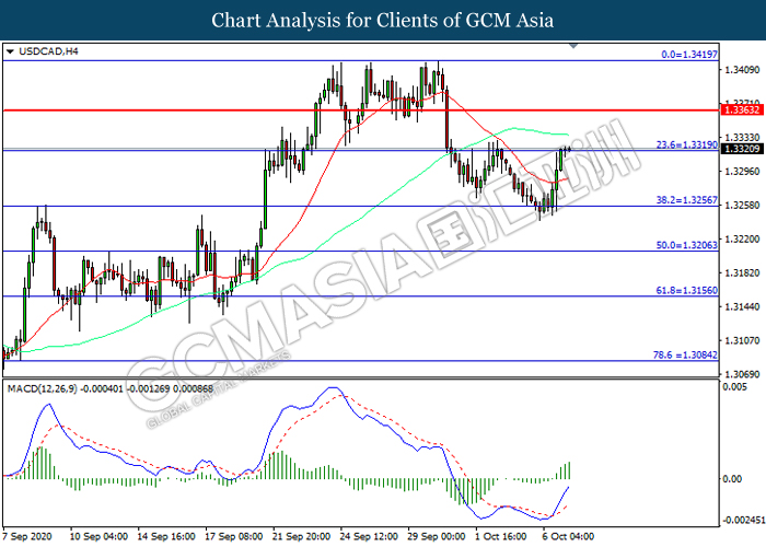 USDCAD, H4: USDCAD was traded higher while currently testing the resistance level at 1.3320. MACD which illustrated increasing bullish momentum suggest the pair to extend its gains after it successfully breakout above the resistance level.
