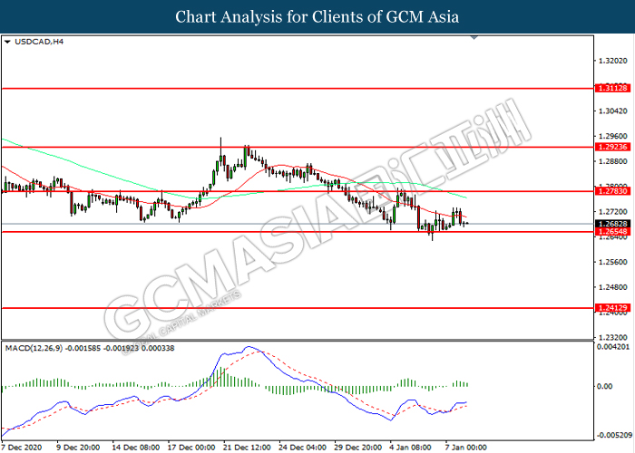 USDCAD, H4: USDCAD was traded lower while currently testing the support level at 1.2655. MACD which illustrated diminishing bullish momentum suggest the pair to extend its losses after it successfully breakout below the support level.