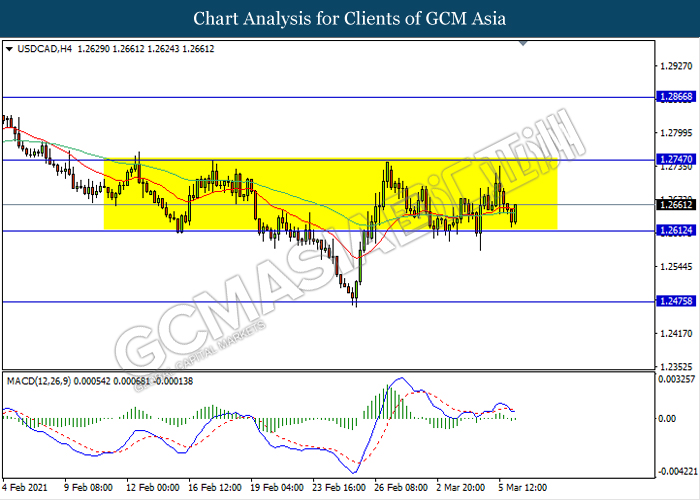USDCAD, H4: USDCAD remain traded in a sideway channel while currently trading near the support level 1.2610. However, MACD which illustrate bearish bias signal suggest the pair to be traded lower after it breaks below the support level.