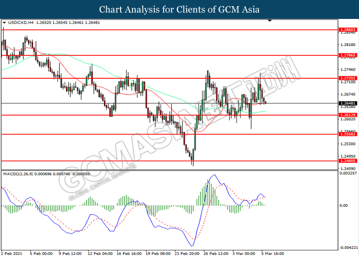 USDCAD, H4: USDCAD was traded lower following prior retracement from the resistance level at 1.2720. MACD which illustrated diminishing bullish momentum suggest the pair to extend its losses toward support level at 1.2615.