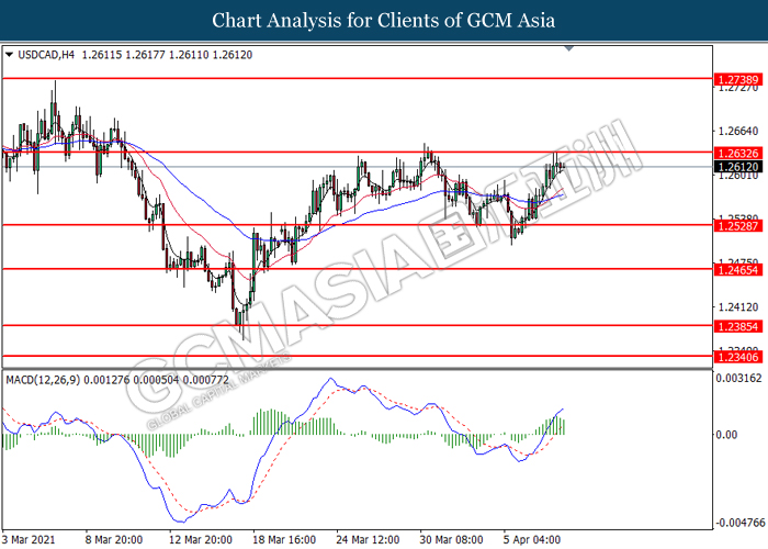 USDCAD, H4: USDCAD was traded higher following prior rebound from the support level at 1.2530. MACD which illustrated bullish bias momentum suggests the pair to extend its gains toward the resistance level at 1.2635.