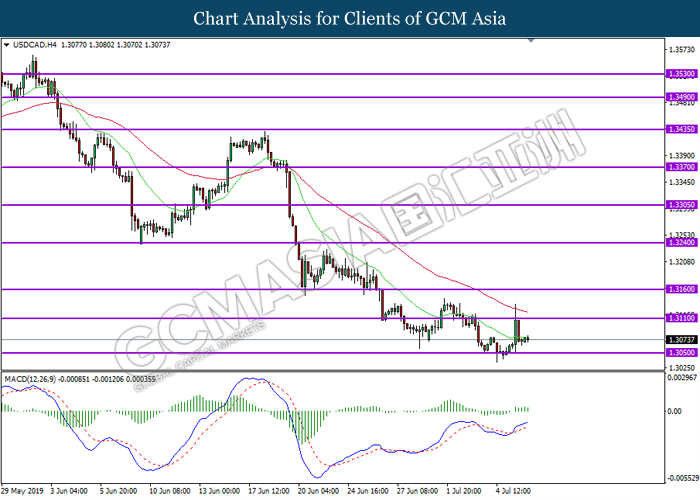 USDCAD, H4: USDCAD was traded lower following prior retracement from the resistance level 1.3110. MACD which display diminishing bullish momentum suggest the pair to extend its retracement towards the support level 1.3050.