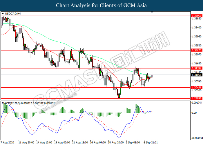 USDCAD, H4: USDCAD was traded higher following prior rebound from the support level at 1.3045. MACD which illustrated increasing bullish momentum suggest the pair to extend its gains toward resistance level at 1.3140.