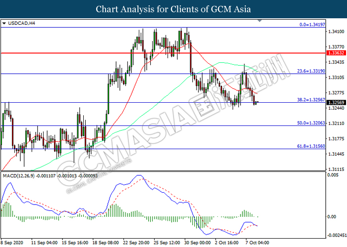 USDCAD, H4: USDCAD was traded lower while currently testing the support level at 1.3255. MACD which illustrated increasing bearish momentum suggest the pair to extend its losses after it successfully breakout below the support level.