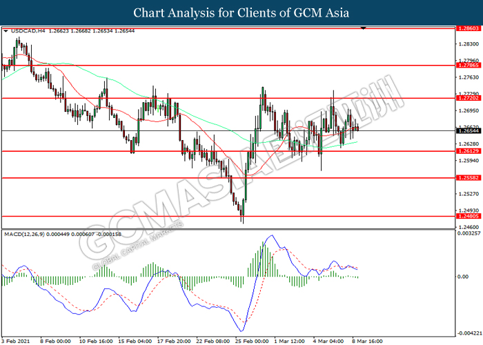 USDCAD, H4: USDCAD was traded lower following prior retracement from the resistance level at 1.2720. MACD which illustrated increasing bearish momentum suggest the pair to extend its losses toward support level at 1.2615.