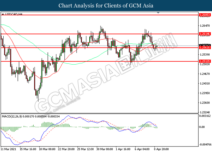 USDCAD, H4: USDCAD was traded lower while currently testing the support level at 1.2565. MACD which illustrated increasing bearish momentum suggest the pair to extend its losses after it successfully breakout below the support level.