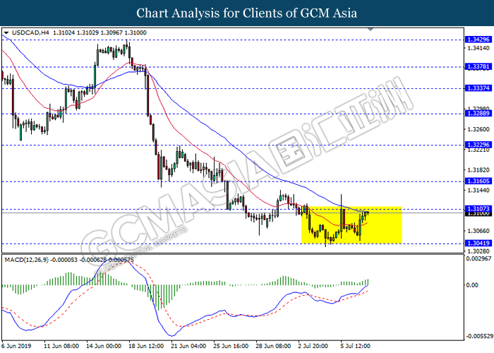 USDCAD, H4: USDCAD remain traded in a sideway channel while currently testing near the resistance level 1.3105. However, MACD which illustrate persistent bullish bias signal suggest the pair to be traded higher after it breaks above the resistance level.