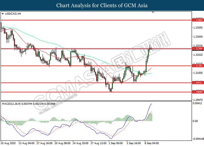 USDCAD, H4: USDCAD was traded higher while currently testing the resistance level at 1.3235. However, MACD which illustrated diminishing bullish momentum suggest the pair to be traded lower in short-term as technical correction.