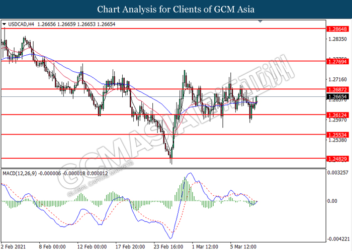USDCAD, H4: USDCAD was traded higher following prior rebound from the support level at 1.2610. MACD which illustrate diminishing bearish momentum signal suggest the pair to extend its gains toward the resistance level at 1.2685.