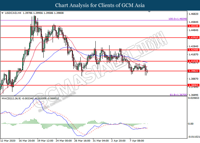 USDCAD, H4: USDCAD was traded lower while currently testing the support level at 1.3980. Due to lack of signal from MACD, it is suggested to wait for further confirmation such as breakout or rebound before entering into the market.