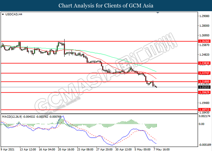 USDCAD, H4: USDCAD was traded lower following prior breakout below the previous support level at 1.2180. However, MACD which illustrated diminishing bearish momentum suggest the pair to be traded higher in short-term as technical correction.