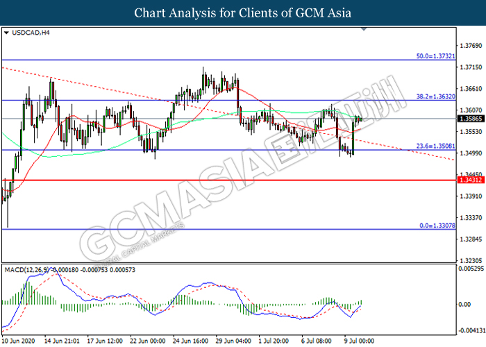 USDCAD, H4: USDCAD was traded higher following prior rebound from the support level at 1.3510. MACD which illustrated increasing bullish momentum suggest the pair to extend its gains toward resistance level at 1.3630.