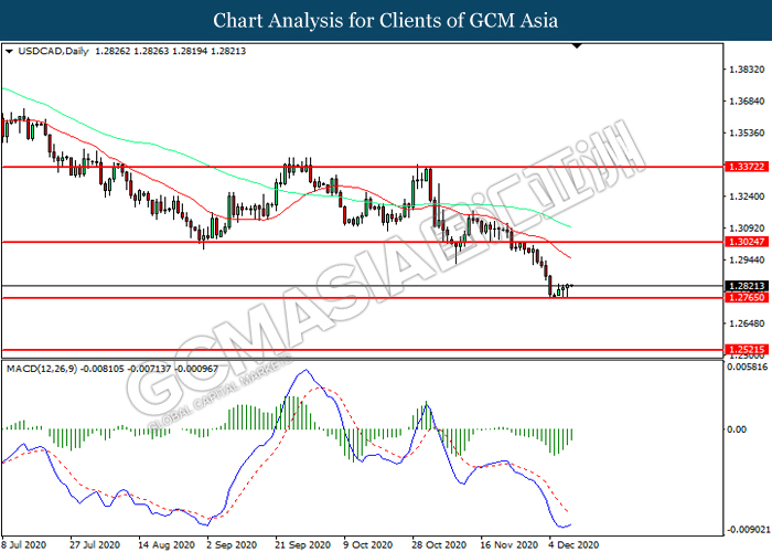 USDCAD, Daily: USDCAD was traded lower while currently testing the support level at 1.2765. However, MACD which illustrated diminishing bearish momentum suggest the pair to be traded higher in short-term as technical correction.