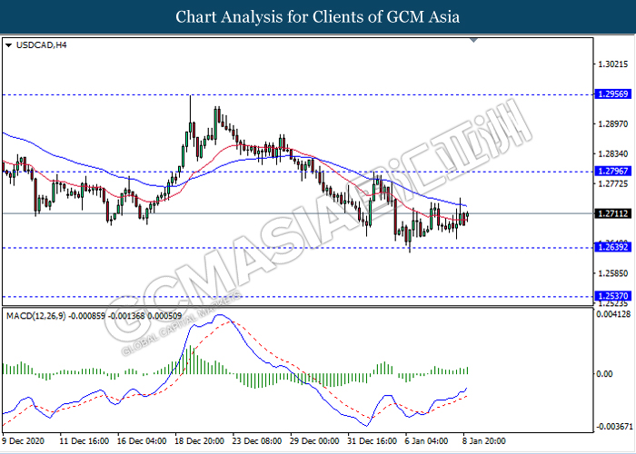 USDCAD, H4: USDCAD was traded higher following prior rebound from the support level 1.2640. MACD which illustrate persistent bullish momentum signal suggest the pair to extend its gains towards the resistance level 1.2795.