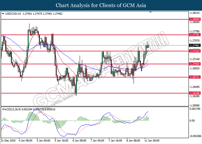 USDCAD, H4: USDCAD was traded higher following prior breakout above the previous resistance level at 1.2730. MACD which illustrate bullish bias momentum suggest the pair to extend its gains toward the resistance level at 1.2770.