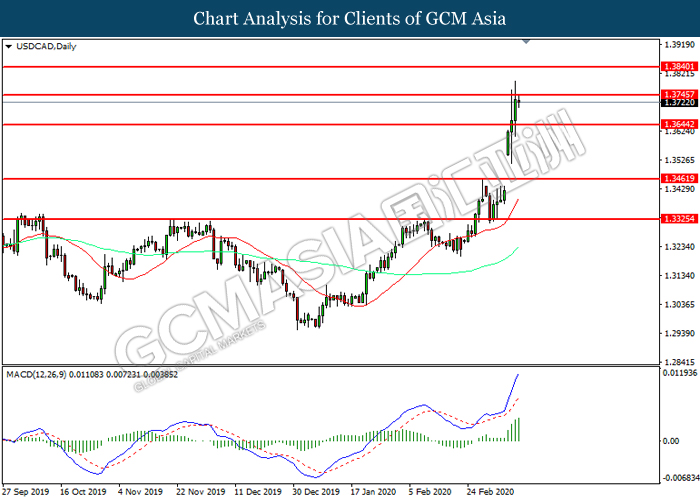 USDCAD, Daily: USDCAD was traded higher while currently testing the resistance level at 1.3745. MACD which illustrated increasing bullish momentum suggest the pair to extend its gains after it successfully breakout above the resistance level.
