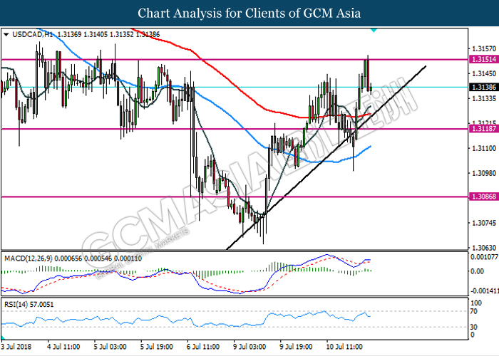 USDCAD, H1: USDCAD was traded lower following prior retracement from the resistance level 1.3150. MACD and RSI which indicate continuous bullish momentum support by MACD golden cross suggest the pair could be traded higher in tandem with its major trend after break above the resistance level of 1.3150.