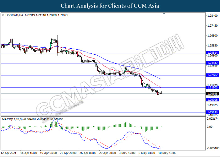 USDCAD, H4: USDCAD was traded lower following prior breakout below the previous support level 1.2150. However, MACD which illustrate diminishing bearish momentum signal with the starting formation of golden cross suggest the pair to be traded higher in short term as a technical correction towards back the level 1.2150.
