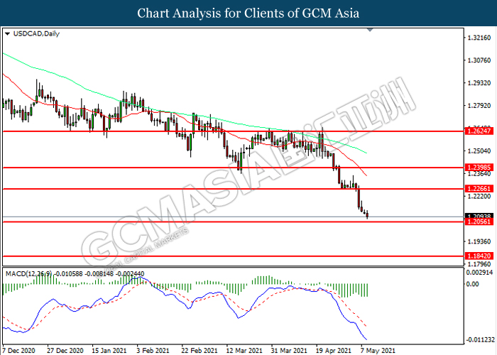 USDCAD, Daily: USDCAD was traded lower while currently testing the support level at 1.2055. MACD which illustrated increasing bearish momentum suggest the pair to extend its losses after it successfully breakout below the support level.