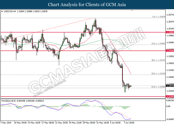 USDCAD, H4: USDCAD was traded higher following prior rebound from lower levels. MACD which illustrate bullish signal suggests the pair to extend its rebound in short-term as technical correction.