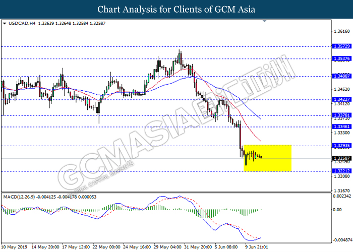 USDCAD, H4: USDCAD was traded flat in a sideway channel. However, MACD which illustrate bullish bias signal with the golden cross formation suggest the pair to be traded higher towards the resistance level 1.3295.