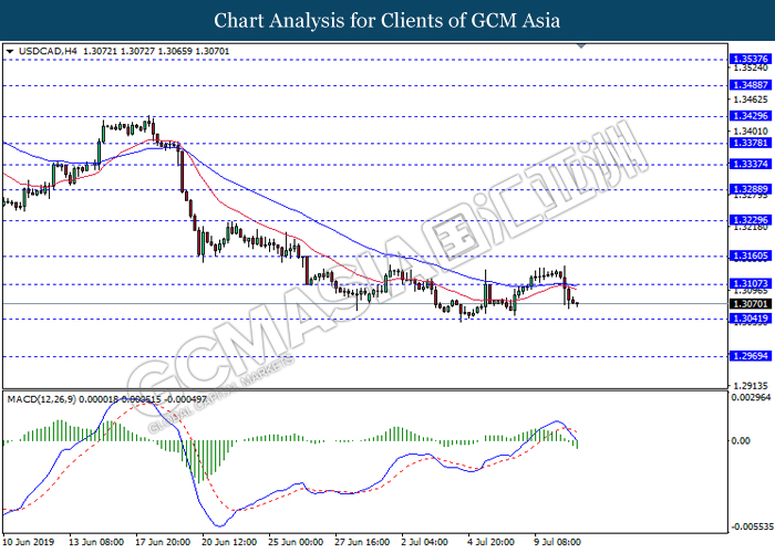 USDCAD, H4: USDCAD was traded lower following prior breakout below the previous support level 1.3105. MACD which display bearish bias signal with the formation of death cross suggest the pair to extend its losses towards the support level 1.3040.