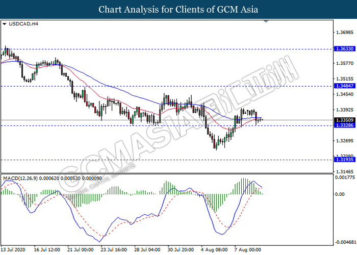 USDCAD, H4: USDCAD was traded lower while currently testing near the support level 1.3330. MACD which illustrate diminishing bullish momentum signal suggest the pair to extend its losses after it breaks below the support level.