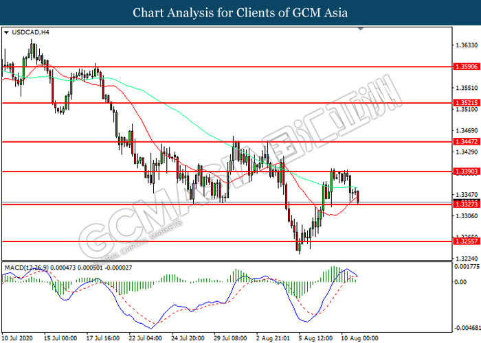 USDCAD, H4: USDCAD was traded lower while currently testing the support level at 1.3325. MACD which illustrated diminishing bullish momentum suggest the pair to extend its losses after it successfully breakout below the support level.