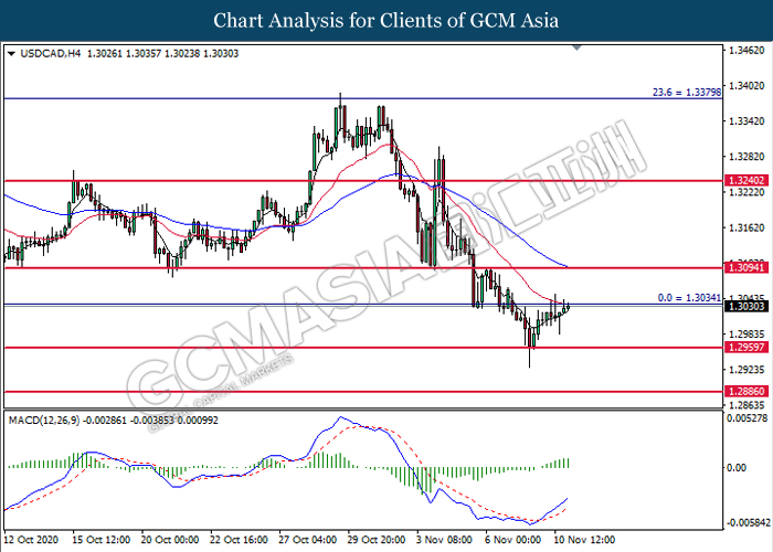 USDCAD, H4: USDCAD was traded higher while currently testing the resistance level at 1.3035. MACD which illustrate bullish bias momentum signal suggest the pair to extend its gains after it successfully breakout above the resistance level.