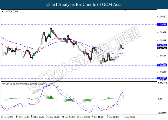 USDCAD, H4: USDCAD was traded lower following prior retracement from the resistance level 1.2795. MACD which illustrate diminishing bullish momentum signal suggest the pair to experience a technical correction towards the support level 1.2640.